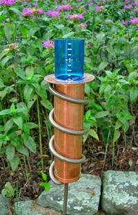 But inside the flute, an unbreakable blue polycarbonate measurement tube and foam float wait patiently for rain. As rain falls into the collection flute, the blue tube rises to show water levels. Eureka! That's cool! |