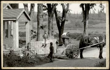 A horse and wagon loaded with Roy Toy building sets leaves the original toy factory, bound for the Machias train station.
